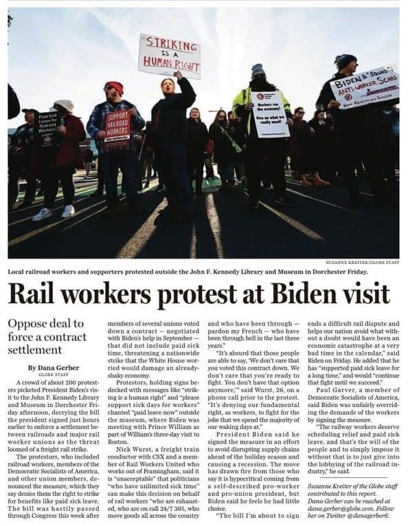 An estimated 200 workers and pro-labor demonstrators greeted Biden’s afternoon visit to the John F. Kennedy Library to meet the UK’s Prince of Wales. They sported signs calling on Biden to “Support Railroad Workers” and declaring “Striking Is a Human Right.” Called on short notice by Boston Democratic Socialists of America, this rally bore witness to ongoing exploitation of the working class in the US.